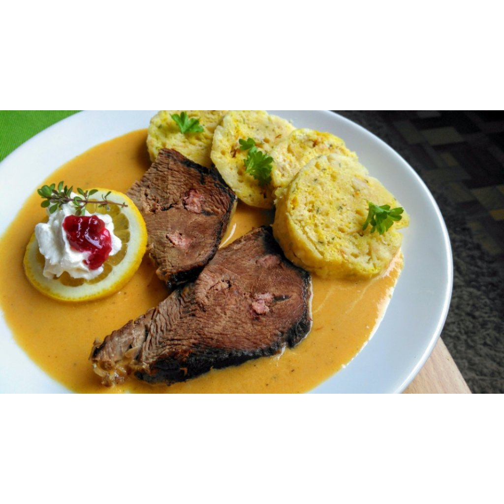 Svíčková na smetaně s vepřovým masem, brusinky, citrón, houskový knedlík 5ks