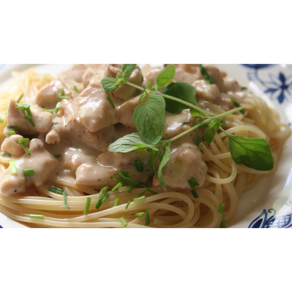 143. Špagety s kuřecím masem a sýrovou omáčko Špagety s kuřecím masem a sýrovou omáčkou